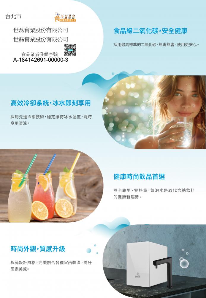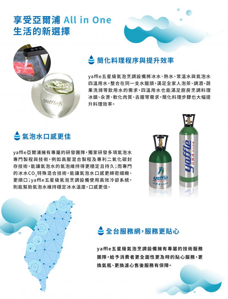 ·產品設備:氣泡冰熱飲機主機、觸控式四溫龍頭、兩道式淨水設備、6公升氣瓶
