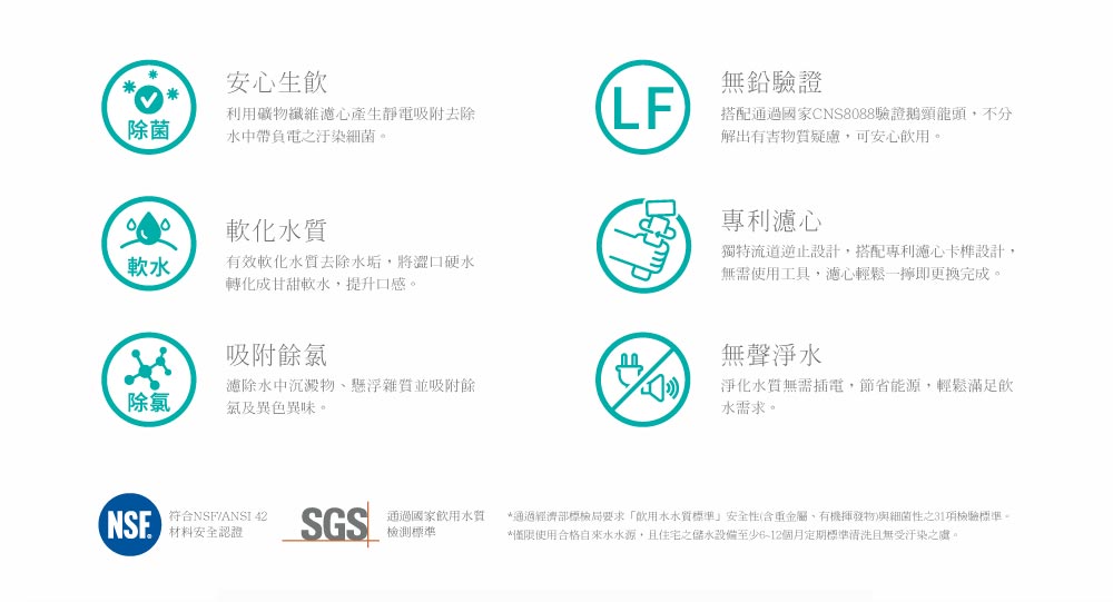 主機淨重(含濾材):1520g 過濾方式:單道複合式 濾心型號:F0263除菌軟水雙效濾心 濾材:活性碳+氫鈉樹脂+天然礦物纖維 過濾流量:2.8L/min 濾心流量:2500L 適用水壓:1~5kg/cm2(15~70psi) 適用水溫:5~38℃ 配件包:濾心座、濾心(除菌軟水雙效濾心)、鵝頸龍頭組 、PE水管、進水三通、減壓閥、漏水斷路器、保證卡、安裝配件 安全保障:通過SGS水質檢測達國家級飲用水標準 適用區域:超硬水區 (彰、高、屏、東) |