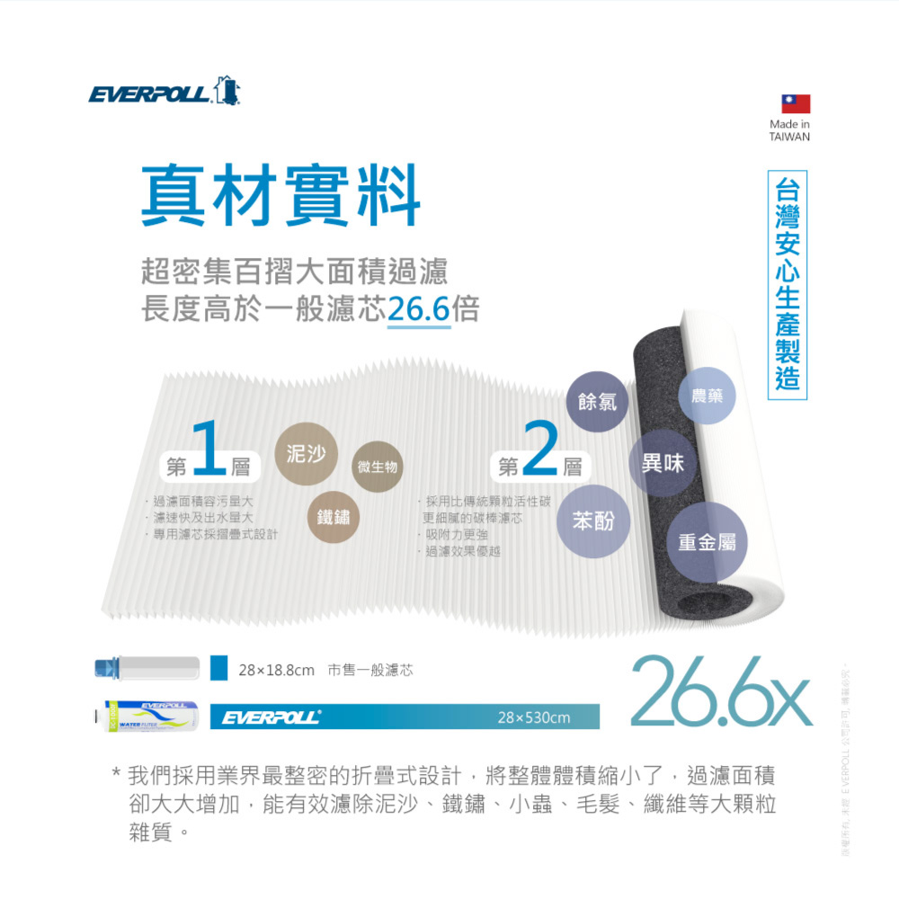 濾心採摺疊式設計,過濾面積大、容污量大、濾速快及出水量大等優點,過濾效果優於傳統濾心。